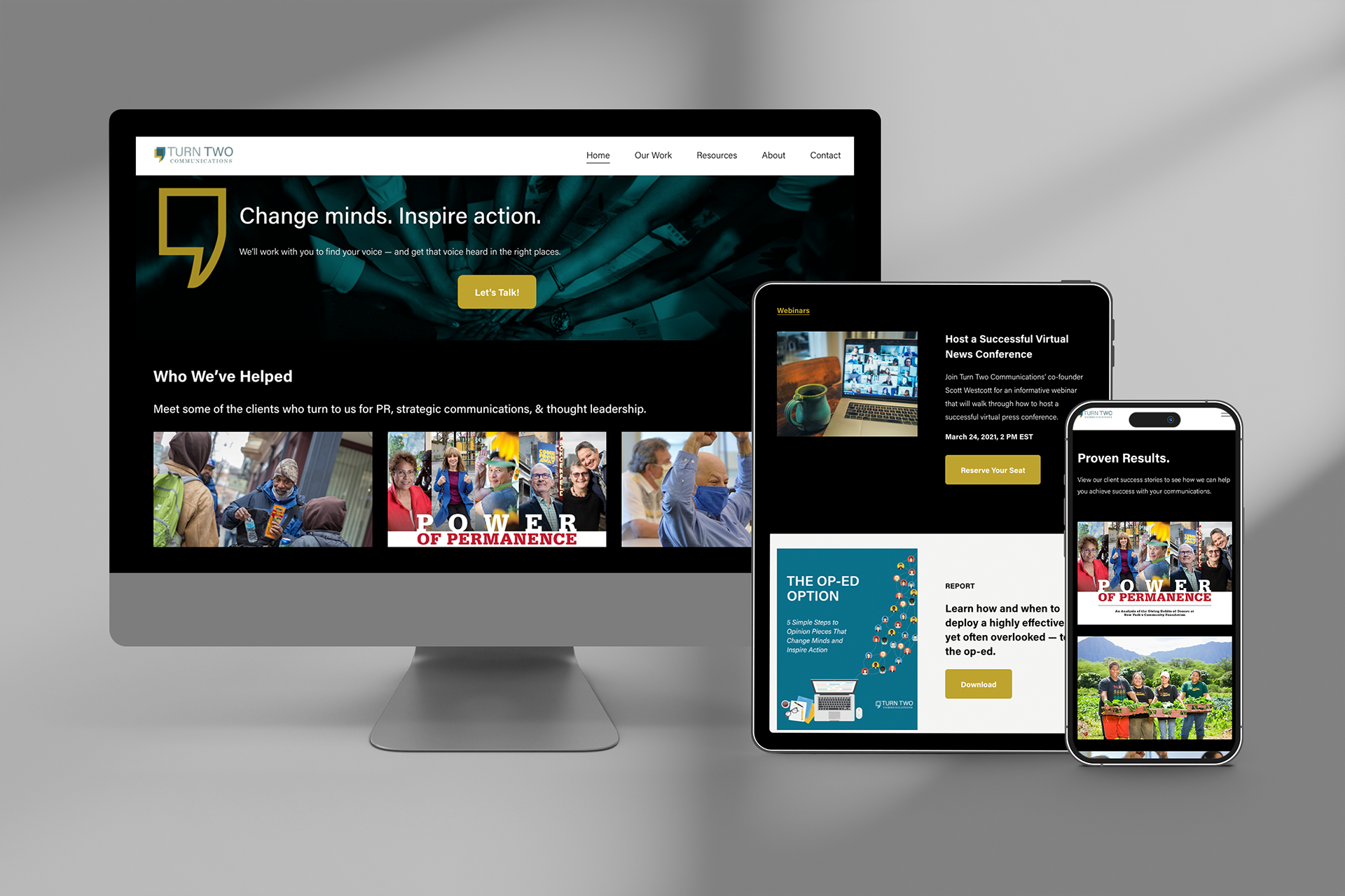 I've worked with Turn Two Communications since its founding, when I created the company's brand identity and the first two iterations of its website. I've also created multiple report layouts and designed a website for one of the firm's clients.